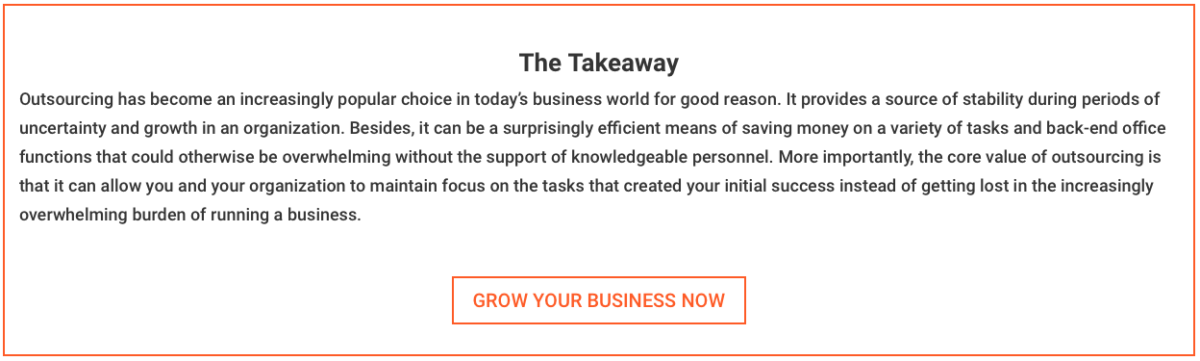 Outsourcing is a strategic approach to growing your organization, saving costs, focusing on core functions, enhancing efficiency, retaining control, achieving flexibility, and managing risks effectively.